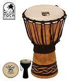 Toca , The Toca TODJ Origins wood djembe is full of character and their liveliness and spirit comes through with every beat. Each shell is hand carved from a single piece of environmentally friendly plantation-grown mahogany wood. The bowl interior has lathe grooves and rough-surfaced carvings to eliminate overtones. Each drum comes fitted with quality hand-selected goatskin heads. The result is an instrument that sounds as earthy and natural as it looks. Also includes Toca Shaker (#TDS-DPS) (Read More)