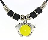 Mevoi , Yellow color sphere brings the highest mental power into the physical body and stimulates higher frequency of thought power for creativity.This pendent necklace features a 12mm(just under 1/2")diameter yellow opal(man made)crystal ball held by two silver plated dolphins,pendent is double sided and slides over a black cord chain of 17 1/2"long decorated with silver tone bead and rings and connected to a secure lobster lock.Thank you for shopping with Mevoi! ...